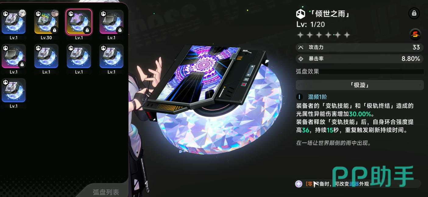 属性层面,“倾世之雨”为S级弧盘,基础攻击力与暴击率数值突出。满级后可提供显著物理伤害加成,并额外提升主角光属性技能伤害。其核心机制在于:释放变轨技能后,能大幅强化环合强度;若该效果重复触发,还可刷新持续时间,形成稳定的增益循环,在中后期高强度战斗中具备极强的战略价值。