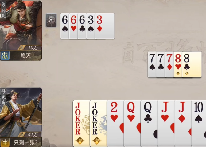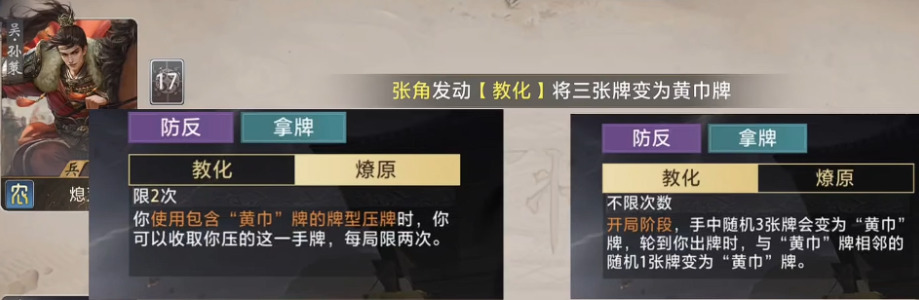 张角属于黄巾军阵营高优先级输出兼控场型角色。其核心机制围绕“黄巾牌”展开:开局即自动将手牌中三张随机牌转化为黄巾牌;此后每轮准备阶段,可将任意一张与已存在黄巾牌相邻的手牌再次转为黄巾牌。该特性显著提升连续牌型(如顺子、连对)的成型概率。而连续牌型在结算时具备防御加成效果,能有效削弱敌方主动进攻行为。随着场上黄巾牌数量增加,张角的战术选择面同步拓宽,常规封印、干扰类手段对其限制效率明显下降。