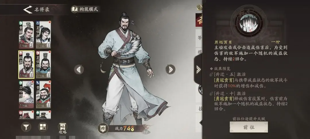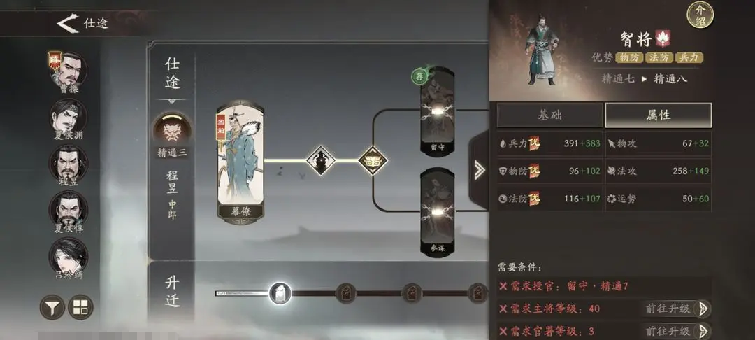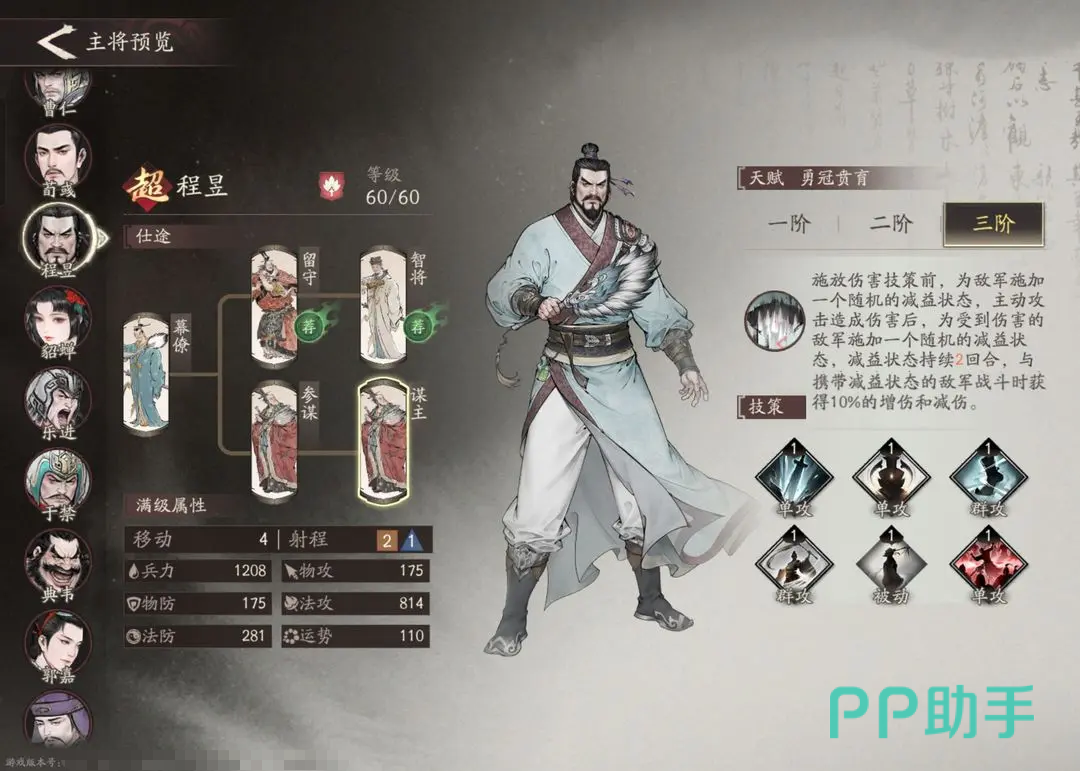 程昱的初始天赋效果为:在发动主动攻击、群体攻击或参与合击造成伤害后,可使目标附加一个随机的负面状态,持续两回合;进阶至二阶天赋后,当与带有DEBUFF的敌方单位交战时,自身所获得的减伤与增伤效果均提升10%;而三阶天赋则规定,在释放技能并造成伤害前,会先对目标施加一层减益效果,这意味着他能独立稳定触发二阶天赋的增益条件。