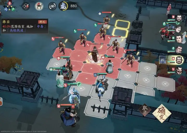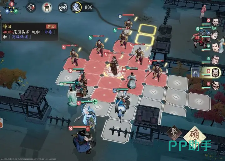 终极技“十面埋伏”则是在目标周围四格内召唤出四个继承程昱60%属性的步兵单位,这些召唤单位不仅具备一定输出能力,还会对接触敌人附加“中毒”状态。尽管它们不具备主动攻击能力,但通过站位封锁可有效限制敌方移动,形成实质性的战场禁锢,使敌军难以脱身。