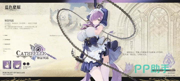 弗利斯代表性角色为姬瑟贝露——拥有梦幻淡紫色长发与蓝白配色经典女仆装束,形象精致优雅;其双手佩戴醒目金属镣铐,整体造型在柔美气质与束缚感之间形成鲜明张力。