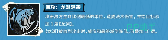 基础输出逻辑始于普攻“龙涎轻袭”:该技能自动锁定当前血量百分比最低的敌方单位,施加法术伤害,并叠加1层“龙渊”状态。此状态最多可叠至10层,每层均削弱目标减伤比例,形成随时间递增的破防效果——前期专注叠层,后期伤害呈指数级跃升。