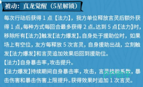 五星被动“真龙觉醒”构成敖烈的核心循环引擎:每次行动后敖烈获得1点“法力”,友方单位释放言灵亦为其额外提供1点(每种方式每回合上限均为2点)。当“法力”累计达5点时,清空并触发“法力爆发”——期间暴击率、攻击力、言灵技能系数、暴击伤害及暴击伤害上限全面提升,并额外追加一次言灵攻击。值得注意的是,“法力”值本身即具成长性:暴击率与攻击力随当前“法力”数值线性提升,实现全程动态增益,而非仅限爆发瞬间生效。