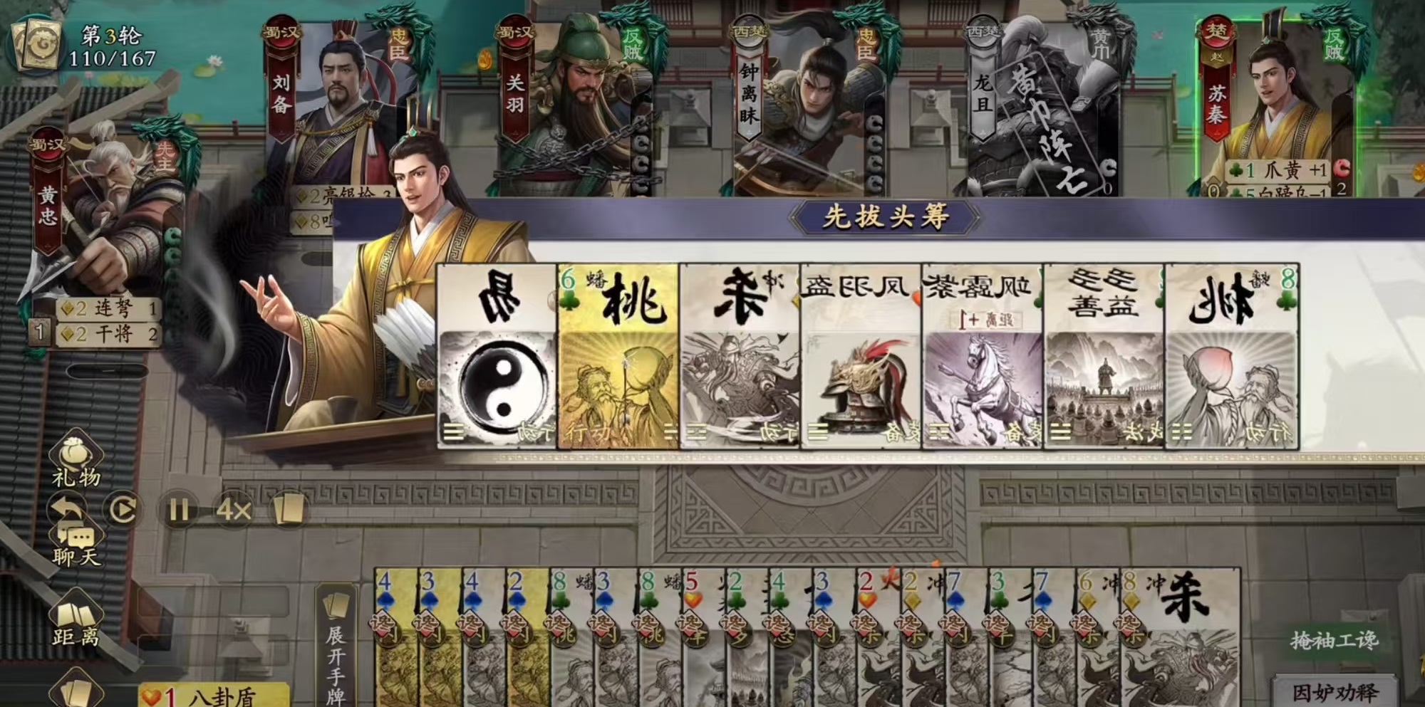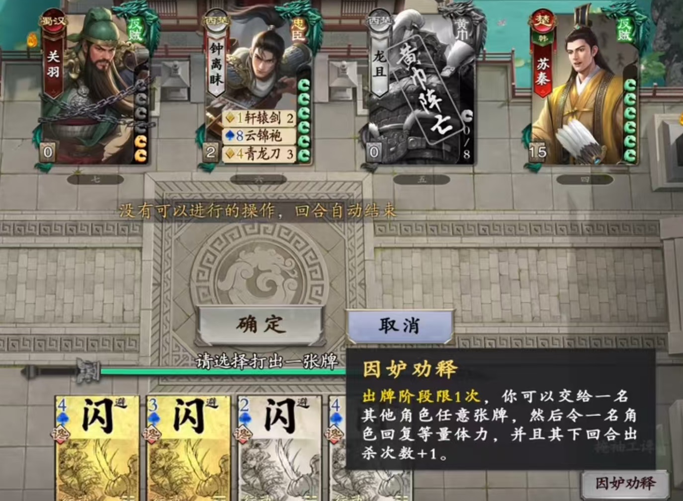 第三个技能是合纵,出牌阶段限用一次,允许玩家查看并增强某一名角色手中的一张牌。场上每存在一种不同势力,该技能的可发动次数便增加一次。特别地,若苏秦自身拥有两个不同的势力身份,则也视为额外的一种势力类型。这意味着他可以通过强化己方关键牌提升输出或防御,也能通过操控敌方牌来引导战局走向,例如将一张普通【杀】升级为造成两点伤害的效果,实现战术突袭。