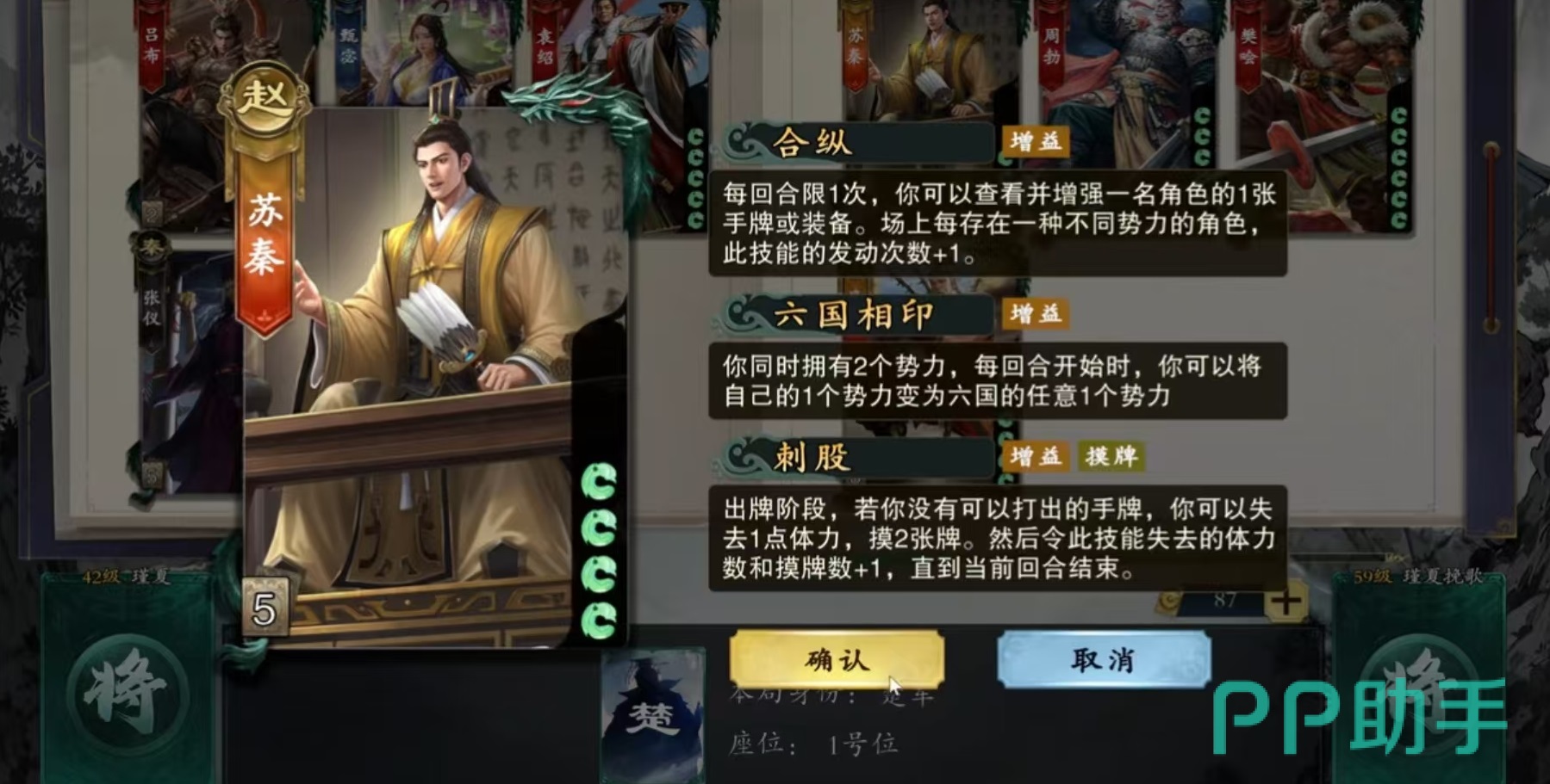 第二个技能为六国相印,赋予苏秦同时具备两个势力身份的能力。每回合开始阶段,玩家可将其中一个势力更改为六国中的任意一方,且两者可相同。这一机制极大提升了他在势力联动方面的适应性。