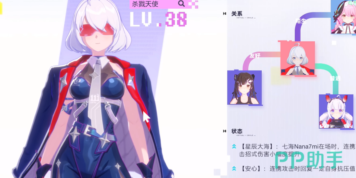 在队伍搭配上,杀戮天使能够与其他角色产生有效的联动效果。当七海出现在场上时,她的连招伤害会获得小幅提升;若存在安心这一角色,则可在协同比攻击时回复部分抗压值,增强续航能力。而当永雏塔菲同队时,敌方援护触发概率将显著降低,从而为杀戮天使创造更多无干扰的输出窗口。