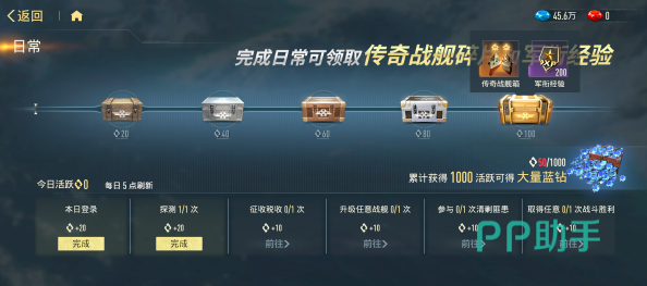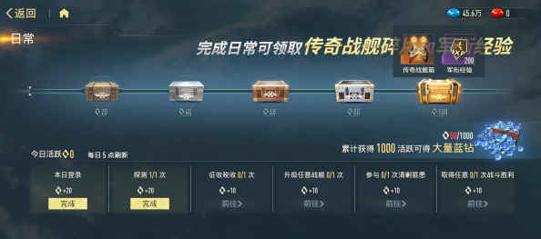 日常活跃体系提供可持续碎片供给。完成每日任务可累积活跃度,满100点后解锁战舰碎片宝箱,内含多阵营通用碎片、传奇舰船专属碎片及军衔经验材料。该机制每日重置,无资源浪费风险,长期坚持可显著缩短热门舰船的合成周期。