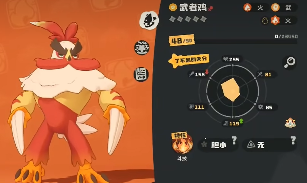 武者鸡定位为火系/武系双属性物理核心输出,主力技能为“炎爆拳”(火系,威力85)与“折翼拳”(武系,威力95)。二者属性互补,可灵活应对不同抗性阵容。常规配招推荐:炎爆拳、折翼拳、强健体魄(提升物攻与物防)、火焰冲锋(先制+1,火系物理攻击)。其中强健体魄是关键增益技,建议起手释放以叠加输出基数;火焰冲锋则保障先手压制力,尤其在对抗高速宠时优势显著。