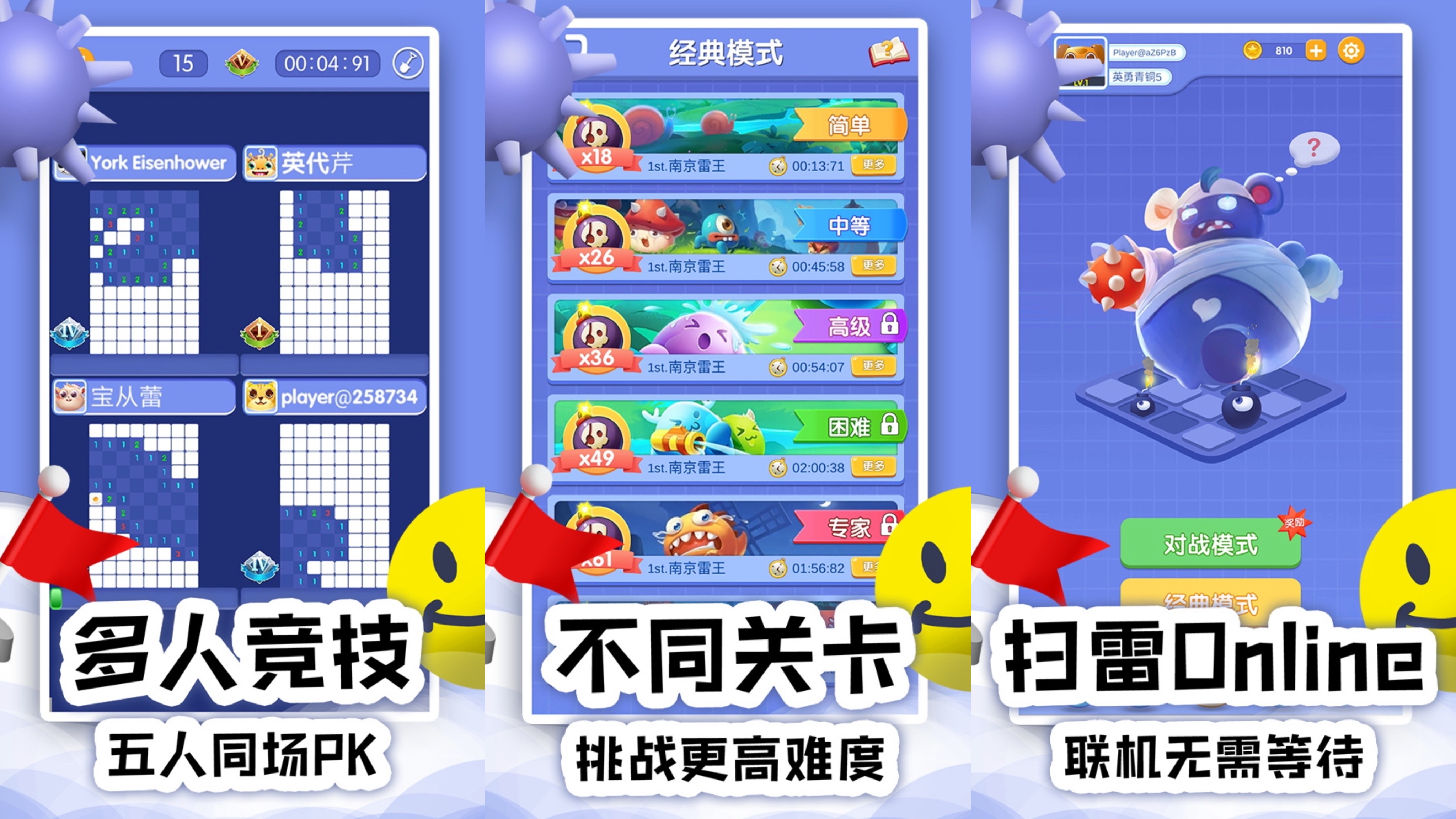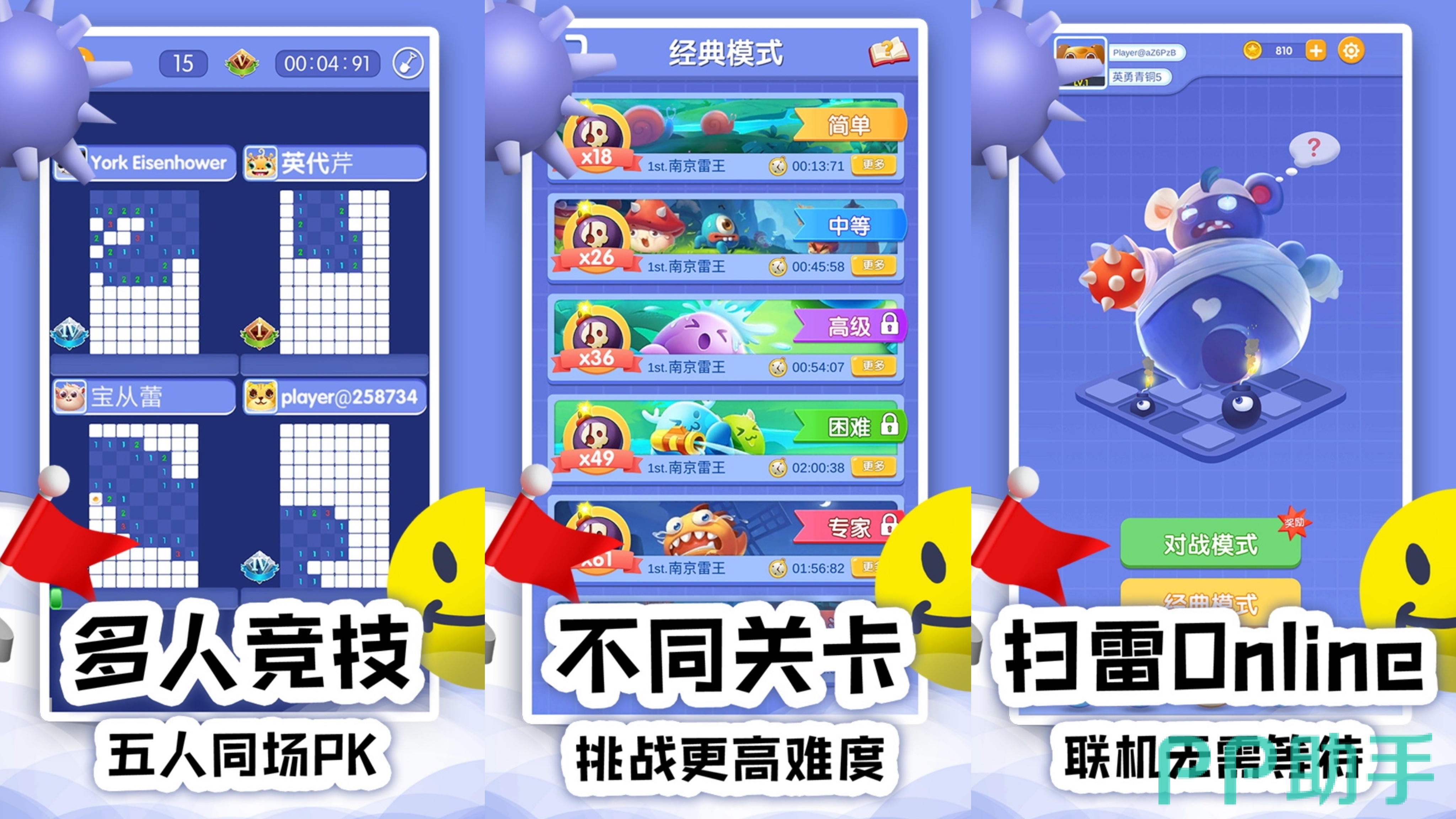 扫雷小游戏相信很多小可爱们都不陌生了,这款扫雷online就是大家熟悉的扫雷玩法!但是在这里,不再是单机扫雷,你可以和不同的玩家联机扫雷,这是一场扫雷竞技,看看谁的扫雷技术更加厉害!当然作为闯关游戏,关卡是必不可少的,游戏一共有6种难度,玩家需要完成一个难度挑战之后才能成功开始下一个难度挑战!不一样的扫雷体验,快喊上你的小伙伴来一起扫雷吧!