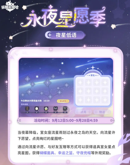 以上便是关于《米姆米姆哈》永夜星愿季的全部内容介绍。此次更新内容丰富,涵盖探索、收集、剧情与装饰等多个维度,无论你是追求故事深度的玩家,还是热衷于外观搭配与家园建设的爱好者,都能在此找到属于自己的乐趣。限定道具与独特装扮齐聚一堂,错过将再等一年。立即加入游戏,携手你的米姆伙伴,开启这场星光璀璨的冒险之旅吧!