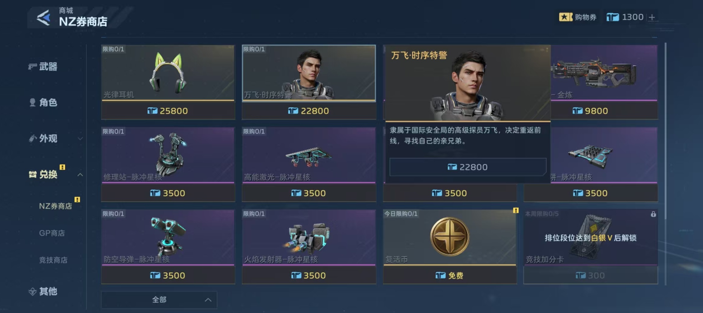 所有可操作角色均统一归入游戏内“角色图鉴”界面,玩家可在备战阶段自由切换已拥有的角色。万飞时序特警属于直购型角色,不依赖抽卡或限时活动,开放于主商城的NC券专属分区。其购买入口位于“NC券商店”页签内,图标醒目,支持一键跳转。每位账号限购一次,定价为22800点NC券。NC券可通过完成日常任务、参与排位赛段位奖励、挑战副本关卡及登录累计奖励等常规玩法稳定获取;亦支持通过官方充值渠道按比例兑换。