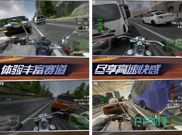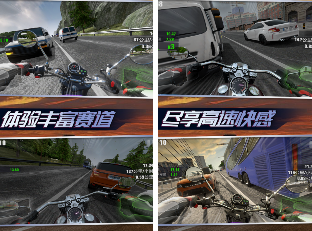 通过第一人称视觉角度,让玩家就可以全身心地沉浸于整个赛场上。无论是赛道还是仪表盘,看上去都是栩栩如生的。在加速时,甚至连仪表盘都会出现对应的变化。玩家所需要做的很简单,通过左右晃动屏幕就能够迅速的控制摩托车,就算是新手也可以操作。游戏还支持多人联机,拥有比较出色的刺激性和竞技性。