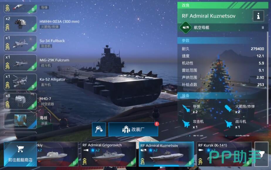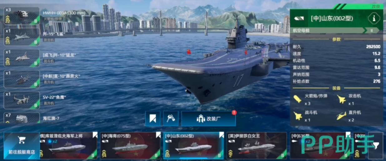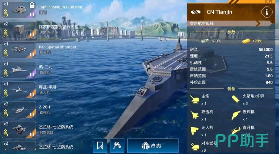天津号通过转盘活动获取,主打火箭炮与无人机群压制。配备4座火箭炮和2架攻击无人机,近距离爆发极高,适合清理敌方潜艇或脆皮驱逐舰。舰载机选择AV8B(反潜+空战)弥补防空短板。操作时需预判敌方走位封堵路线,并频繁利用掩体规避伤害。生存能力较弱是其最大缺点,而且是氪金船,需要大家最好掌握航母玩法之后进行进阶。