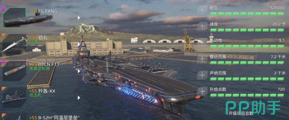 PANG需通过活动礼包获取,属性均衡且生存能力较强。它搭载战斧导弹与多型号舰载机,适合远程骚扰和消耗战。推荐配置F35B(垂直起降)负责侦查与反潜,死神无人机(对地轰炸)清理据点。实战中保持10公里以上距离,用导弹干扰敌方阵型,避免正面交锋。缺点是缺乏战斗机,需依赖队友点亮灯。