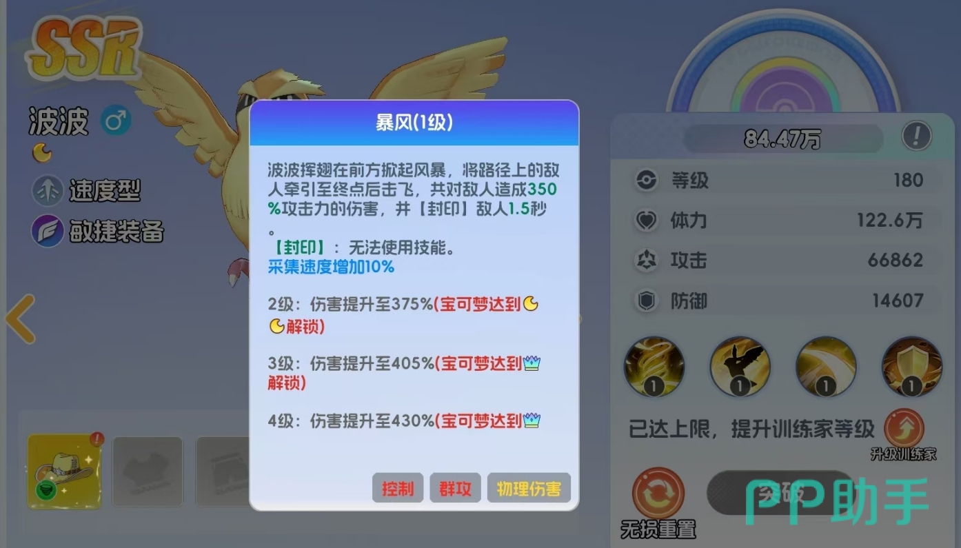 波波的基础属性偏向敏捷成长,1级即可释放核心大招——风暴突袭。该技能不仅沿直线路径造成高额物理伤害,更附带强制击飞效果及持续2回合的技能封印(禁用所有主动技能),实现伤害、位移、控场三重压制。11级解锁的“疾风突进”使其可在战斗开场瞬间跃入敌方后排区域,大幅缩短输出前置时间;至41级习得“空气斩”后,三段式连招链正式成型:突进→爆发斩击→追加风暴扫荡,形成对脆皮远程单位的高效压制循环。值得注意的是,当敌方后排部署以远程攻击为主力的宝可梦时,波波将自动触发专属被动增益,获得额外攻击力提升,进一步放大其针对后排的击杀效率。