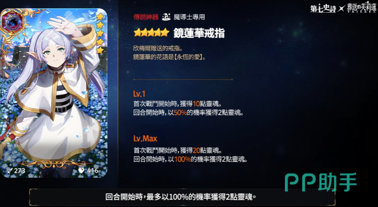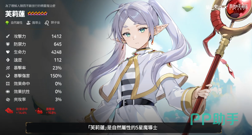 在第七史诗与葬送的芙莉莲的联动版本中登场的芙莉莲,定位为自然属性魔导士,其角色设计高度还原原作气质。她在队伍中主要担任群体伤害核心,清场效率极高,尤其擅长应对密集小怪群。除了高额AOE输出外,她还能通过技能为队友提供能量支持,有效加快全队技能循环节奏。此外,她特有的免伤机制进一步增强了战场生存能力,避免了传统脆皮输出角色容易暴毙的问题。她的主动技多以广域魔法攻击为主,部分技能命中后可触发额外段数伤害或小范围溅射效果,在面对成群敌人时表现尤为出色,对单体精英目标也能维持稳定的压制力。