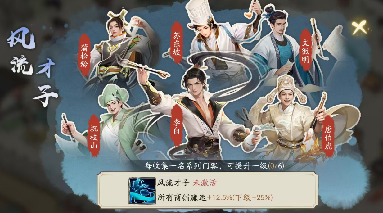 获得苏东坡后,玩家将陆续触发一系列以宋词文化为背景的互动事件。完成诗词问答、情景解谜等任务,可额外领取流水奖励;而他在客栈场景中的高频互动,亦能持续推高店铺人气值,间接带动周边商铺的曝光与收益。此外,苏东坡是“风流才子”羁绊的关键成员,该羁绊需集齐6位同系列门客方可激活:除苏东坡外,其余五人分别为蒲松龄、祝枝山、李白、唐伯虎、文征明。