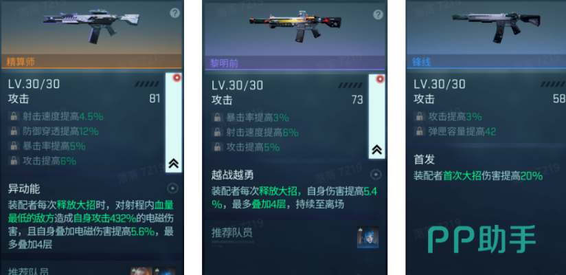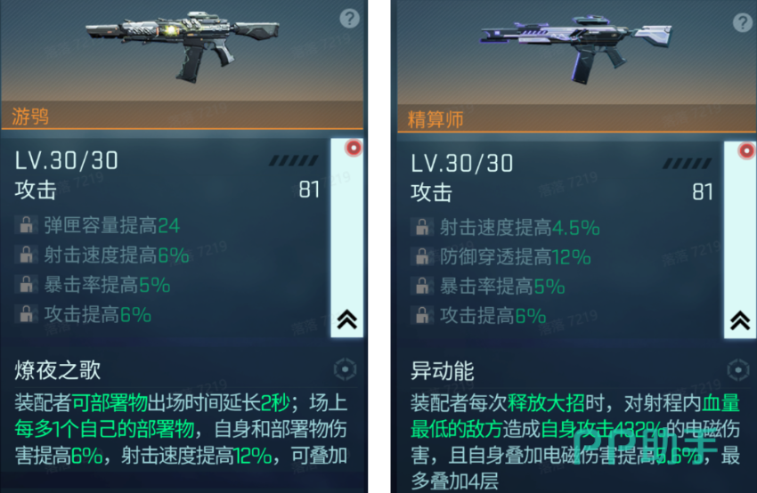 两款备受推崇的SSR级武器——游鸮与精算师,在实战中表现尤为突出。游鸮具备“燎夜之歌”被动技能,装备该武器的角色可使部署物存在时间延长2秒,并额外增加一次部署机会,同时自身及部署单位的伤害提升6%,射击速度提升12%,且该增益状态支持叠加。另一款武器精算师则拥有“异动能”特性,每当角色释放终极技能时,会自动对范围内血量最低的敌人造成相当于自身电磁攻击力432%的伤害,并为自己叠加一层电磁增益,每层提升5.6%电磁伤害,最多可叠加四层。随着更多装配条件解锁,这两把武器的综合输出潜力将进一步放大。