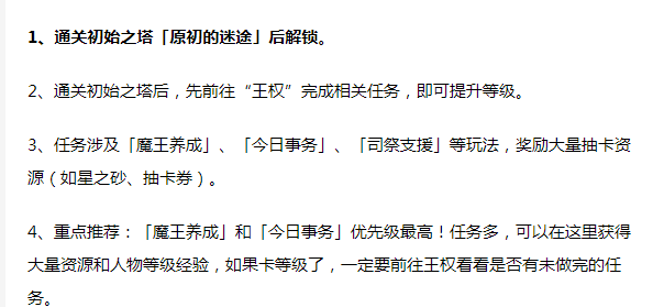 度过新手期后,王权任务将成为主要资源产出途径。当玩家通过“原初的迷途”关卡后,该功能正式开启,提供多种可持续参与的日常玩法模块,如魔王养成、今日事物与司祭支援等。这些任务不仅奖励丰富,涵盖抽卡券、经验材料等多种实用物品,还能辅助提升角色等级。建议优先完成魔王养成和今日事物,因其任务数量多、操作简单且收益高,能快速补充抽卡资源并解决升级瓶颈问题。主线推进受阻时,回过头清理这些任务往往能迅速突破等级限制。