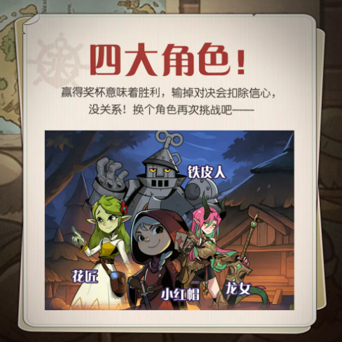 奖杯争夺通过主动挑战持有者实现。成功击败对手可夺取其奖杯,失败则扣除信心值。当信心值归零时,当前角色本轮挑战终止。游戏提供小红帽、花匠、铁皮人、龙女四位可切换主角,任一角色失败后可立即启用其他角色重启征程,形成多线程策略试错机制。