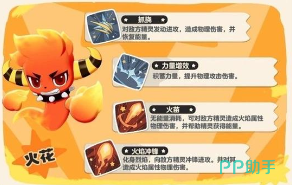 火花是一个火系宠物,在刚开始的初始状态下就是一个小火苗的形态,这个宠物攻击过程中的伤害能力非常优秀,首先可以使用抓挠,给对方带来物理伤害,在这个过程中还能恢复自身的能量,另外角色也可以使用火苗释放伤害,这个伤害是不需要消耗任何能量的,另外就是火焰冲击,这个技能的攻击距离非常远,产生的攻击伤害也很高。