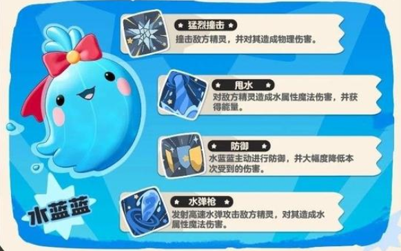 另外就是水蓝蓝,这是一个非常可爱的小水滴形象,这是一个很多玩家都比较喜欢的水系精灵,在攻击过程中可以使用,甩水去给对方带来伤害,另外还有水枪弹,可以高速发射水弹,能给对方带来的是魔法伤害,另外角色还有一个叫猛烈攻击的技能,可以迅速输出攻击对手,主打的是物理伤害,不同的是这个精灵会有一项防御技能,可以通过主动防御降低自己受到的伤害。