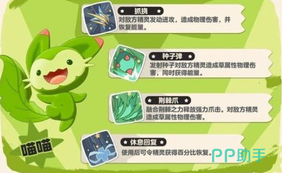 喵喵是一个外观非常可爱的草系角色,外观像一只可爱的绿色小猫,但尾巴却是叶子的形状,使用这个宠物之后,可以发射种子攻击对方的精灵,除了带来物理伤害之外,还能恢复自己的能量,角色还有一个叫荆棘爪的技能,这个技能是能产生强力攻击的,可以同时给对方带来草属性伤害和物理伤害,另外这个角色还有一个抓挠技能,也是能给对方带来物理伤害的,在这个基础上,角色还可以利用休息回复的技能,恢复自己的血量。