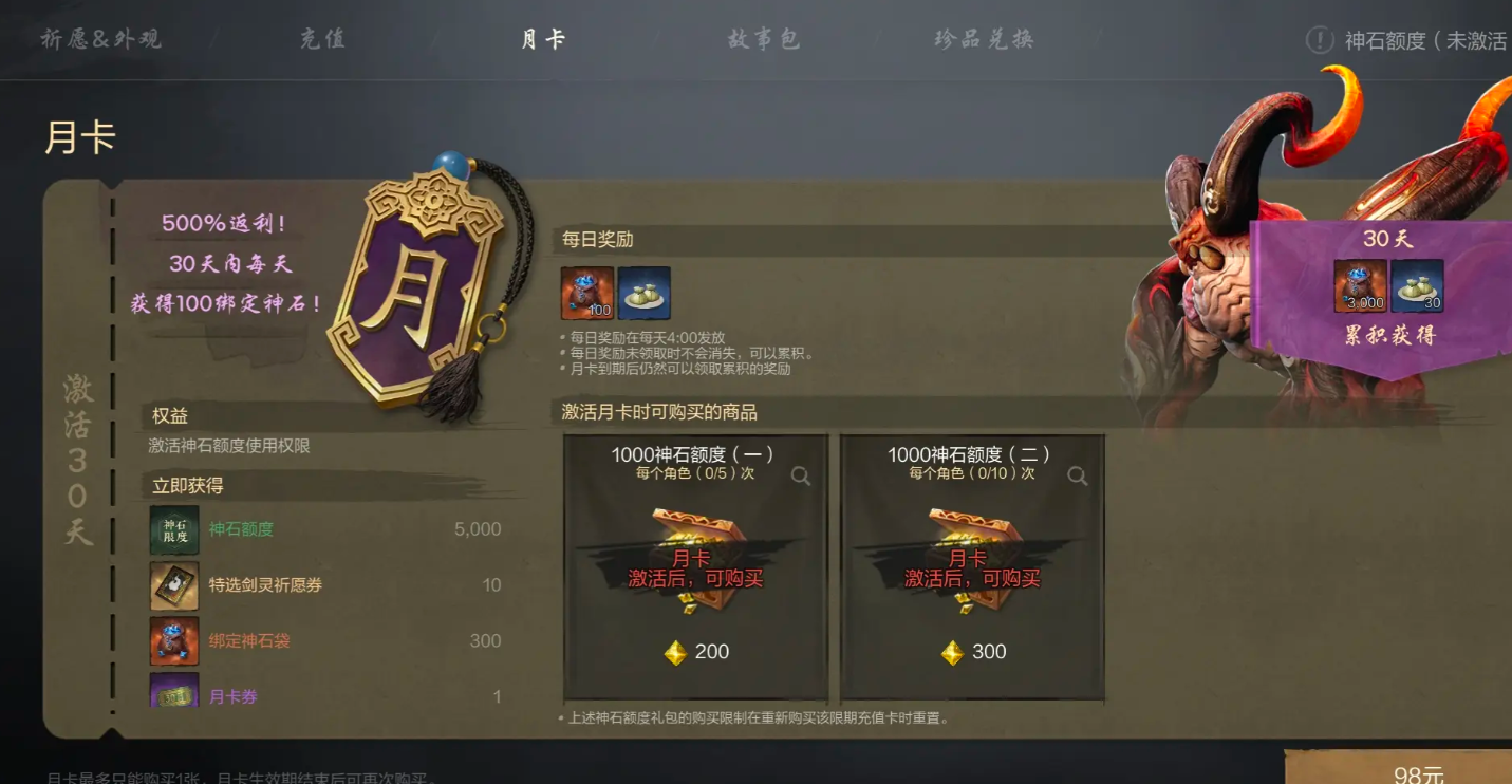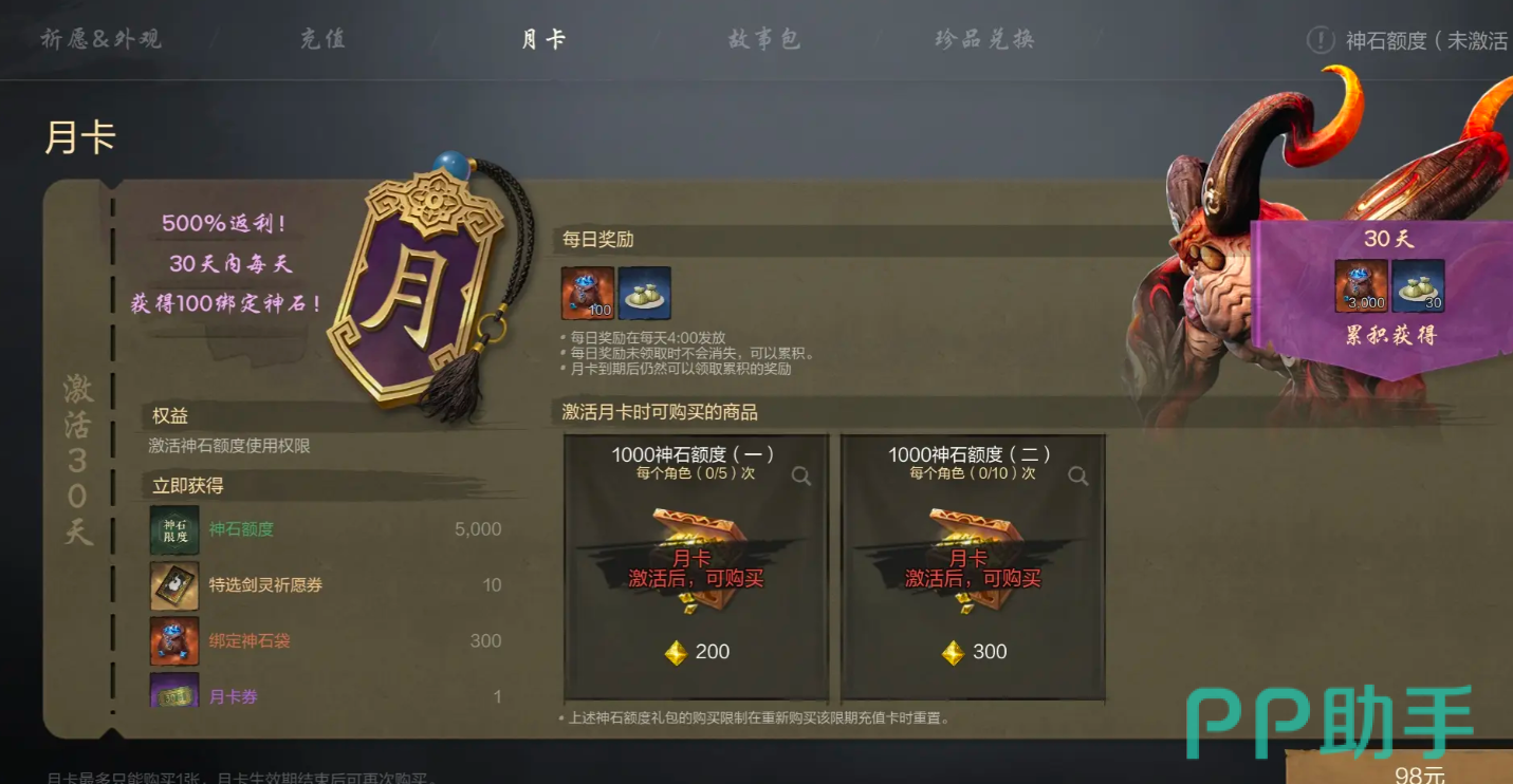 月卡可以在首次充值期间,直接为玩家提供五千点的神石额度,并且在后续的每天内,为玩家提供一千颗神石的奖励,在激活之后,玩家还可以获取绑定的神石券,神石券还能够进一步,为玩家提供三百点的神石。