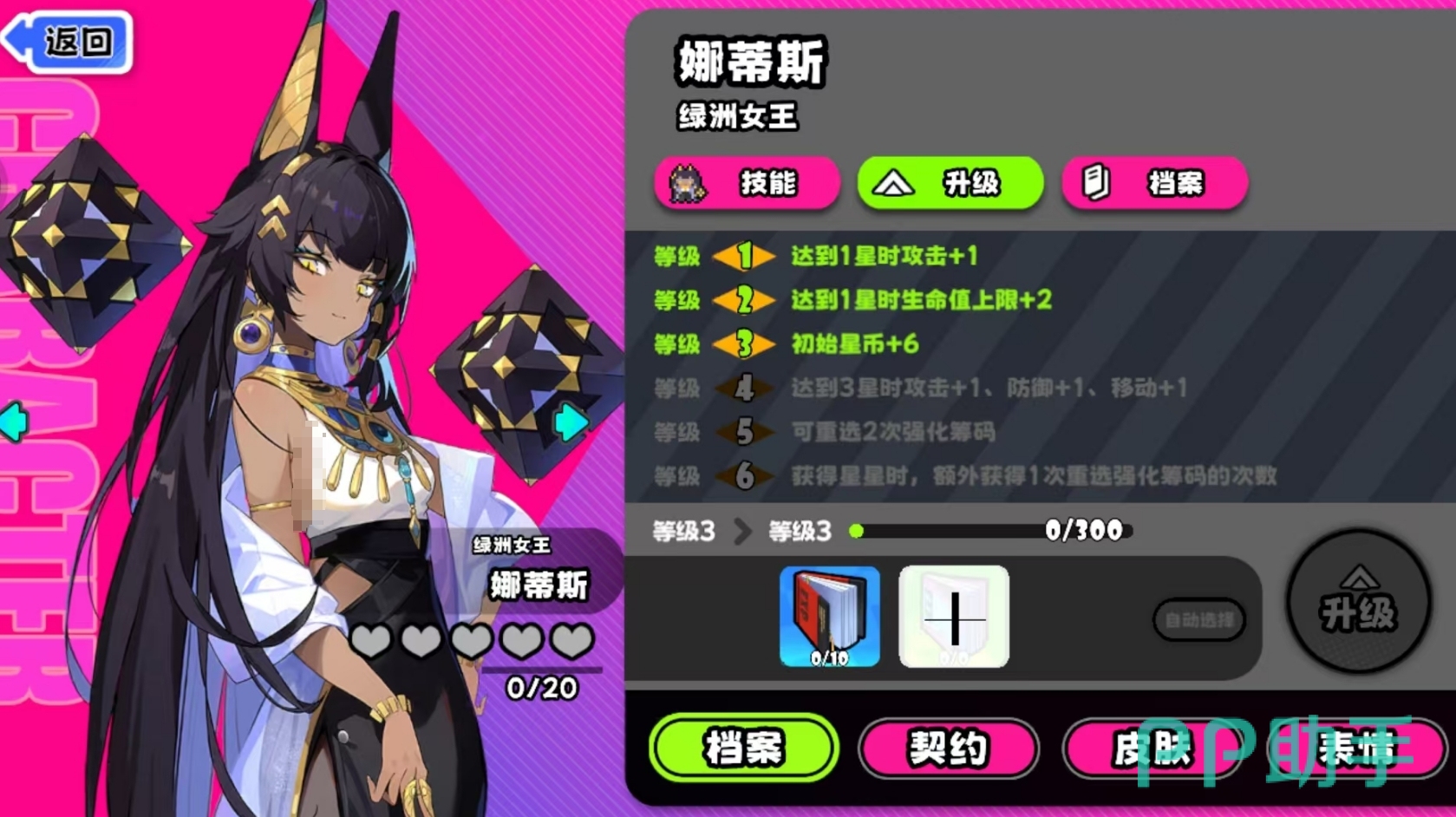 在角色成长路径上,娜蒂斯具备清晰的阶段性收益。等级1即可解锁“获得一星时攻击力+1”的基础增益;升至等级2后,额外激活“一星状态下生命上限+2”,有效提升生存韧性,降低因基础血量不足而意外陷入昏迷的风险;等级3时,初始星币增加6点,大幅优化前期经济运转效率;后续等级4至6则持续强化其后期作战稳定性,尤其在合作模式中,更高的资源积累效率有助于更精准地获取目标筹码,提升团队整体通关效率。