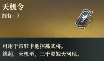 天机令在游戏中可谓是核心道具,它与常驻卡池有着紧密的联系,如果想要获取常驻池中的武将,那么天机令就是必不可少的关键道具,作为抽卡道具,获取它是玩家们游戏进程中的重要环节,毕竟大家主要的常驻角色来源就指望它了。