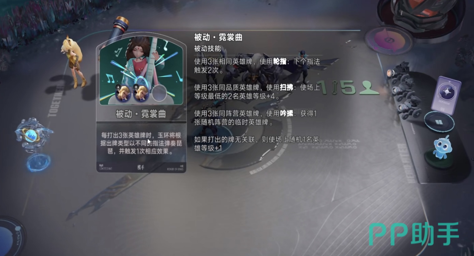 杨玉环的核心机制源于被动技能【霓裳曲】:每连续打出3张棋子,即触发一次琵琶指法效果,具体表现取决于这三张棋子的组合特征。该机制共分四类判定路径—— 第一类:三张棋子完全相同(同名),触发【轮指】,使下一次指法效果重复生效两次; 第二类:三张棋子品质一致(如均为蓝色或紫色),触发【扫拂】,立即将场上等级最低的两张棋子各提升4级; 第三类:三张棋子归属同一阵营(如全部为长安、全部为阿古斯等),触发【吟揉】,生成一张随机阵营的临时棋子(仅当回合生效); 第四类:三张棋子无任何共性(名称、品质、阵营均不同),则随机选取场上一张棋子,使其等级+1。