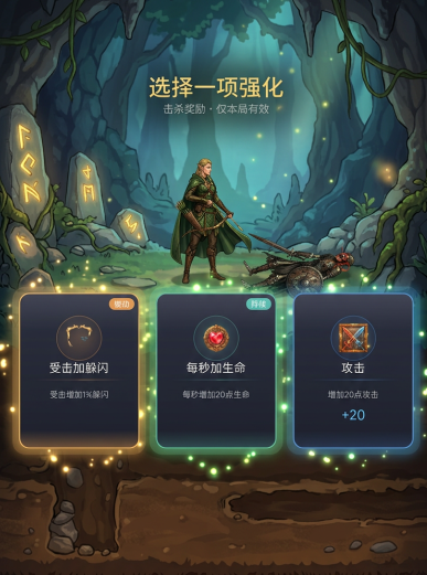 养成体系强调个性化成长路径。角色属性包含攻击力、暴击率、闪避值、吸血比例等多维参数,支持自由加点与装备词条搭配。武器库涵盖基础木弓、火焰弓、冰霜弓、雷电弓等类型,每种弓箭具备独特元素效果与攻击节奏;防具系统亦提供轻甲、皮甲、符文护腕等多阶选择。随关卡推进,玩家可解锁穿透射击(贯穿三名敌人)、万箭齐发(扇形范围爆发)、影袭闪避(短暂无敌+位移)等核心技能,形成专属战斗流派。