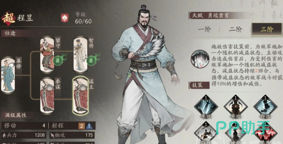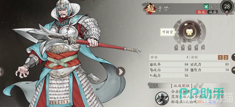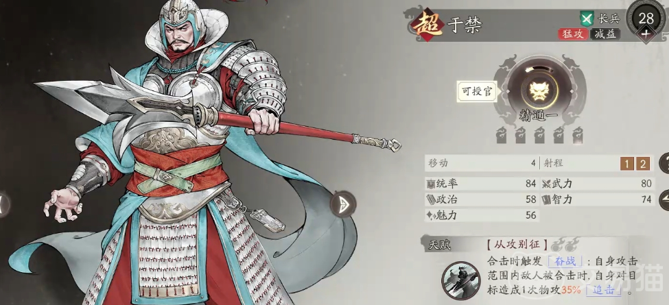 值得注意的是,于禁的实际战斗力高度依赖于队友之间的配合。其中,程昱是与其最为契合的搭档之一。程昱所携带的刚戾鬼谋等技能能够频繁触发合击效果,极大提升了于禁“从攻别征”的触发概率,两者组合可实现高效的连携输出循环。因此,在构建阵容时,应尽量确保于禁与程昱同时登场,以发挥最大战术价值。