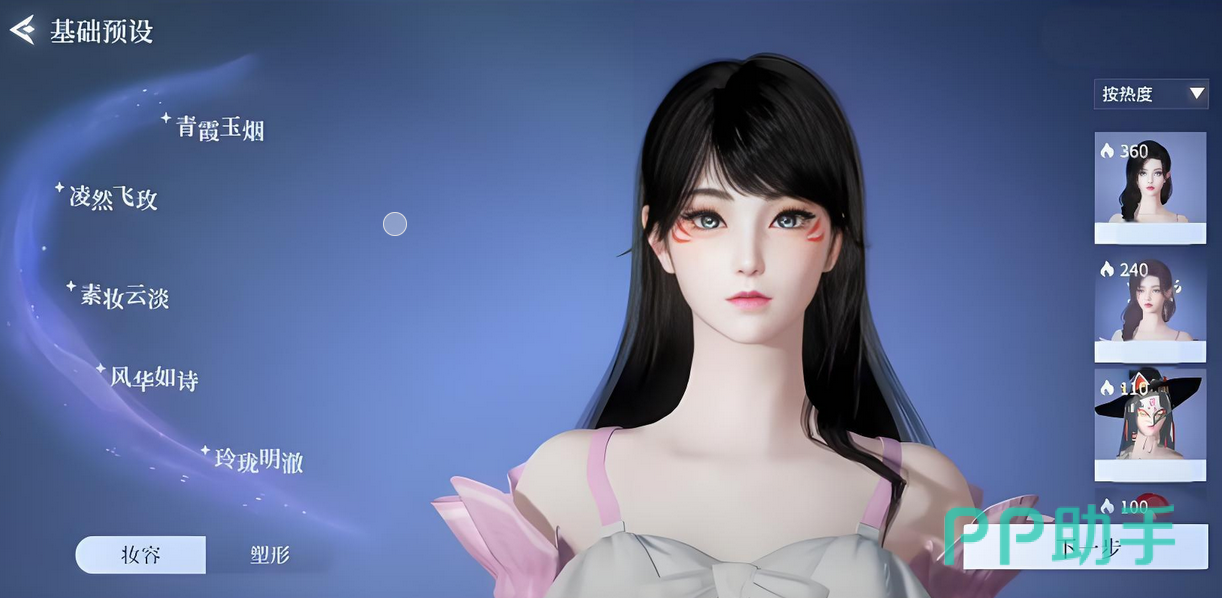 游戏中的捏脸系统涵盖了多个维度的调节项目,满足不同玩家的操作习惯。对于希望快速完成角色创建的用户,系统内置了多种预设模板可供选择。以女性角色为例,现有青霞玉烟、凌然飞玫、素装云淡、风华如诗、玲珑明澈等多种风格,这些模板依据人气排序展示,既可直接使用,也能作为基础进行二次调整,提升个性化程度。