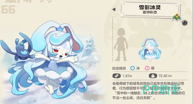 雪影娃娃为冰系精灵,由前置形态“大耳帽兜”进化而来。若希望其进一步成长,必须将等级提升至100级。该等级门槛虽高,但属于纯数值型要求,不依赖特殊道具、特定场景或时间限制。一旦达标,系统将自动完成进化,转变为最终形态——雪影冰灵,各项基础属性与技能效果均实现显著跃升。