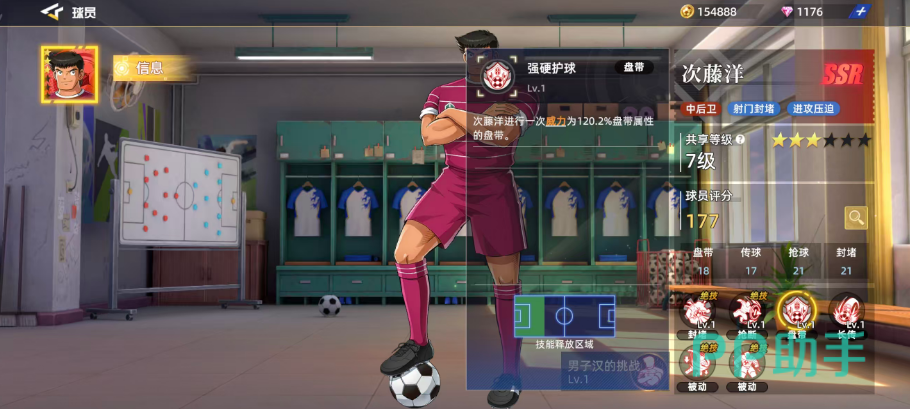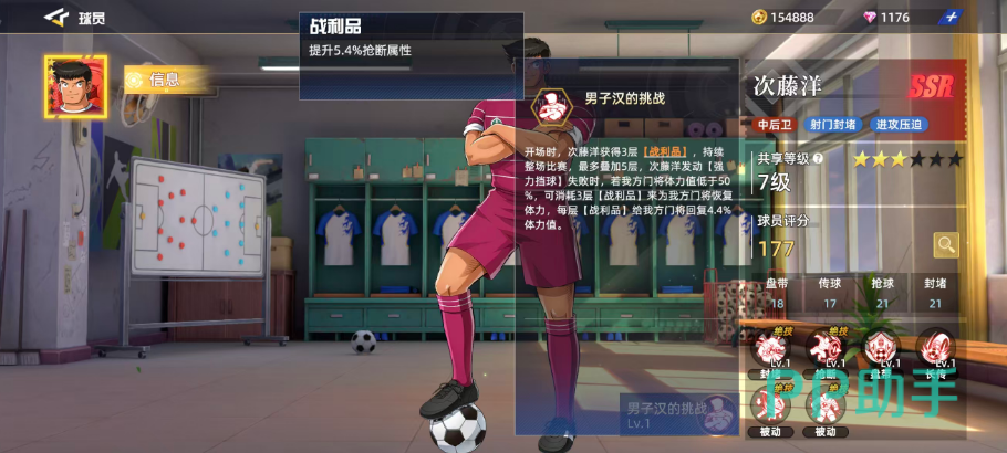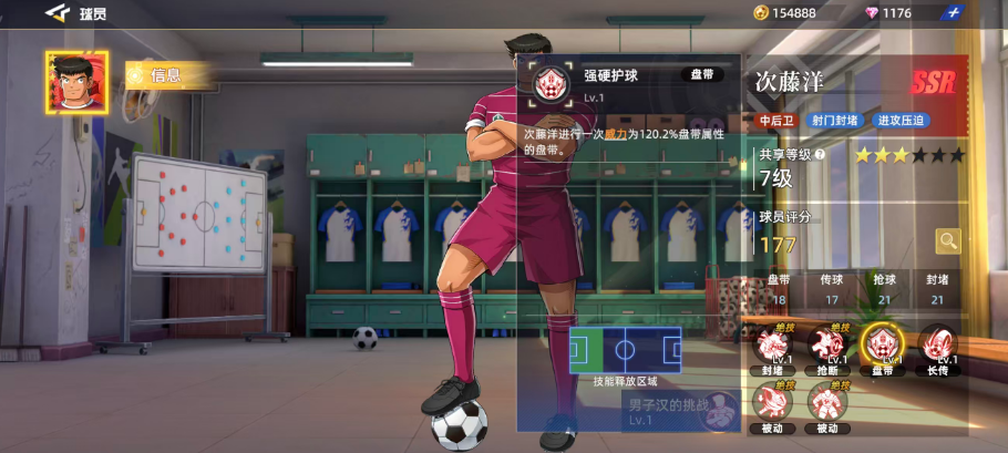 “强力压迫”被动可在封堵属性基础上增加2.8%,并且当对方控制值低于509时,成功发动“强力挡球”还将额外提升5.7%封堵威力,实现条件性爆发增强。更为关键的是“男子汉的挑战”这一开局技能:比赛开始即为次藤洋叠加3层【战利品】状态,每层可持续整场生效,叠满5层后收益更佳。若“强力挡球”释放失败且我方门将体力低于5%,可消耗3层【战利品】为门将恢复体力,每层回复4.4%生命值,具备极强的战术容错与救险能力。