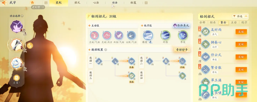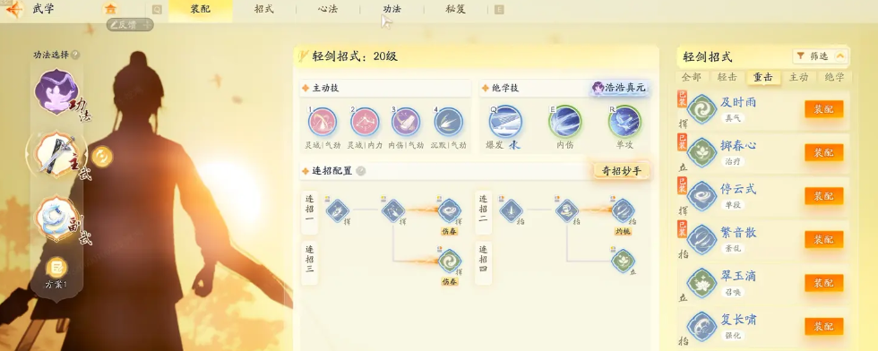 而小编推荐大家试试灵域轻剑套路。这个套路的重击在灵域状态下输出非常可观。轻剑是个攻击范围比较广的远程武器,离BOSS较远,方便我们规避伤害。而且确保有一个技能能造成沉默效果。当看到侯通海开始蓄力的时候,就要马上放出沉默技能,让他无法用技能还手。