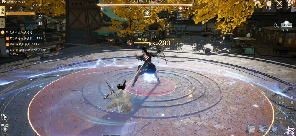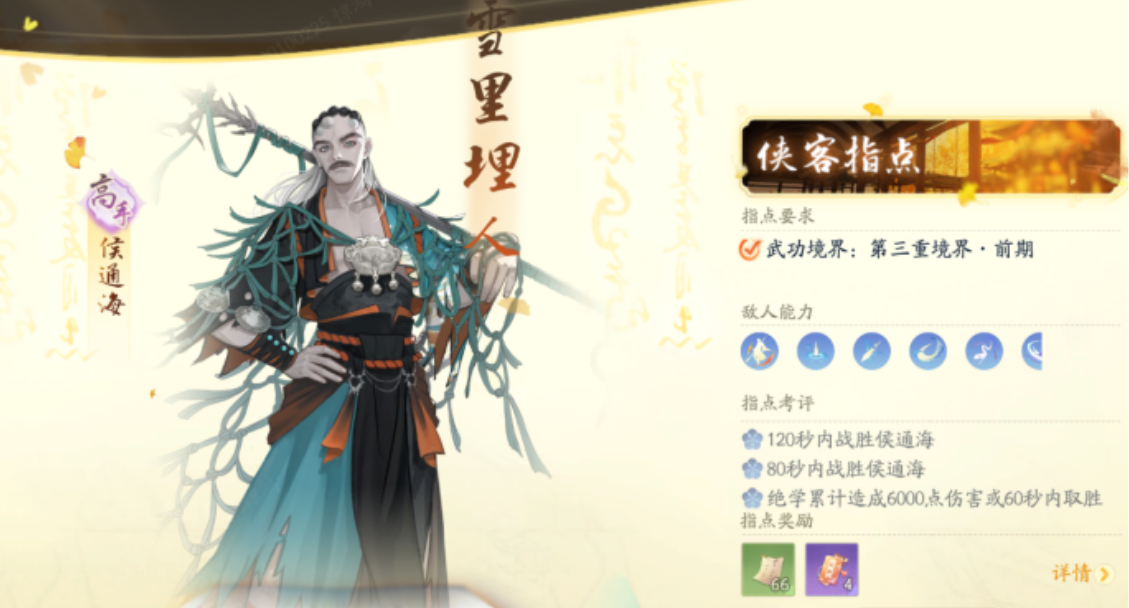 在我们挑战的时候大家还要注意这几点:首先就是想拿三星,就必须要在一分钟之内速刷候通海,或者累计打出6000点神通输出。第二就是侯通海的技能多数都是远程范围攻击,利用轻剑的远程优势,能够很好的强制它的输出能力,完美规避伤害。
