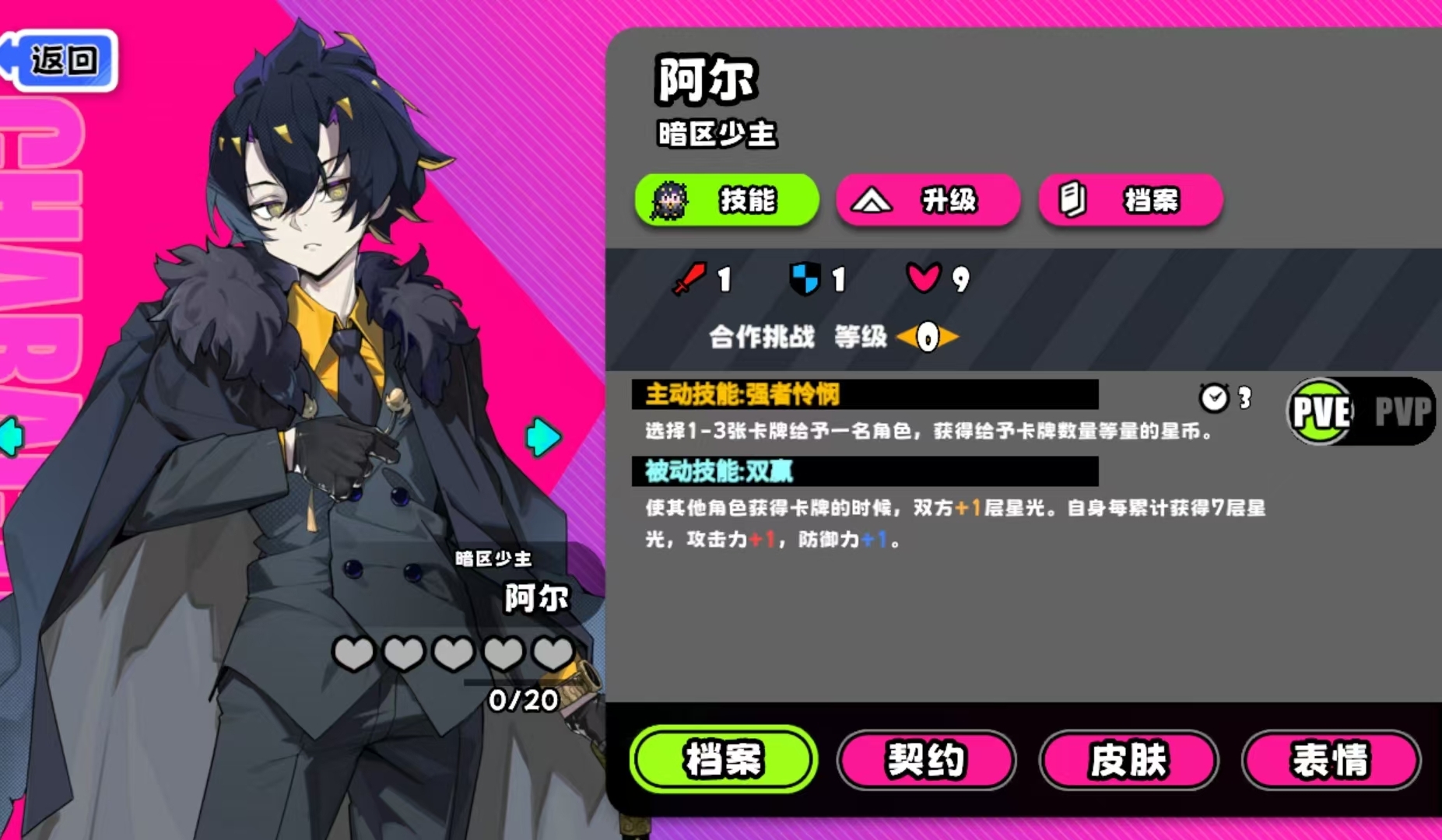 在合作模式中,暗区少主承担关键辅助职能。其主动技能允许向任意一名队友赠送1至3张手牌,每赠送1张即获得1枚星币;同时,每次赠牌均可为自己叠加1层星光效果,累计达7层后永久获得+1攻击与+1防御的属性提升。该机制使其能与依赖星币获取资源的角色形成高效配合——例如通过队友提供的星币在商店购入优质卡牌,再精准分发至缺乏关键手牌的队友手中,显著缓解团队卡手问题,优化整体回合节奏与协同效率。