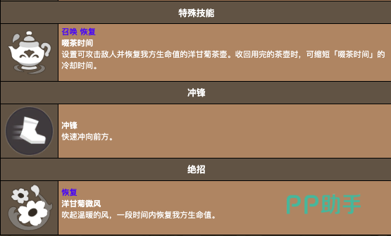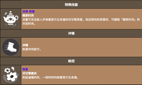 另一主动技能为位移型冲锋技,突进过程中对路径敌人造成伤害,并衔接绝招“洋甘菊微风”,在为队友提供生命恢复的同时触发范围性冲锋伤害,兼顾控场、保人与反打三重战术价值。
