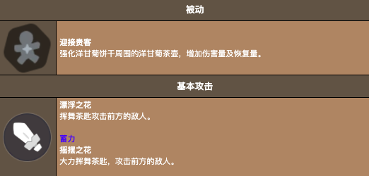 普攻包含两段式设计:“漂浮之花”为前摇蓄力技,挥动茶壶对正前方目标造成基础伤害;“摇摆之花”则在完成蓄力后释放,不仅命中同一区域,更附带额外伤害加成,形成稳定的前排压制输出链。