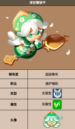 洋甘菊饼干定位为超稀有元素系辅助物型单位,获取途径限定为特别自选饼干扭蛋。其被动技能“迎接贵客”具备双重增益效果:当洋甘菊茶壶被部署在角色周围时,可同步提升全队伤害输出并加快能量恢复节奏,显著延长持续作战能力。