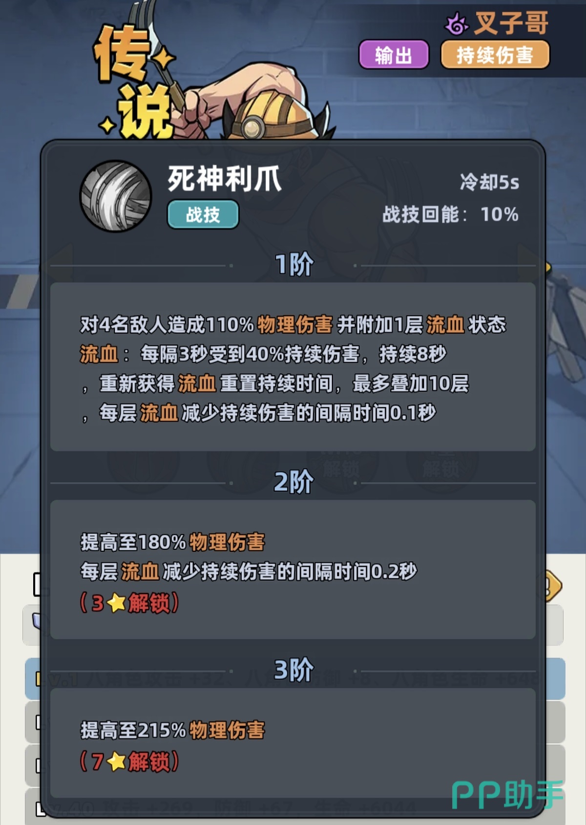 叉子哥拥有传说品质基础属性,在全角色梯队中处于T1上位水平,虽未达T0神话层级,但其职业特性“所有伤害提升25%”与幸存者特性“持续伤害提升10%”,共同强化了以流血DOT为核心的输出模型。该组合使其在多段持续伤害场景下具备显著增益优势,而非依赖单次爆发。想获取更多角色图鉴与实战数据,可前往九游平台免费查阅。