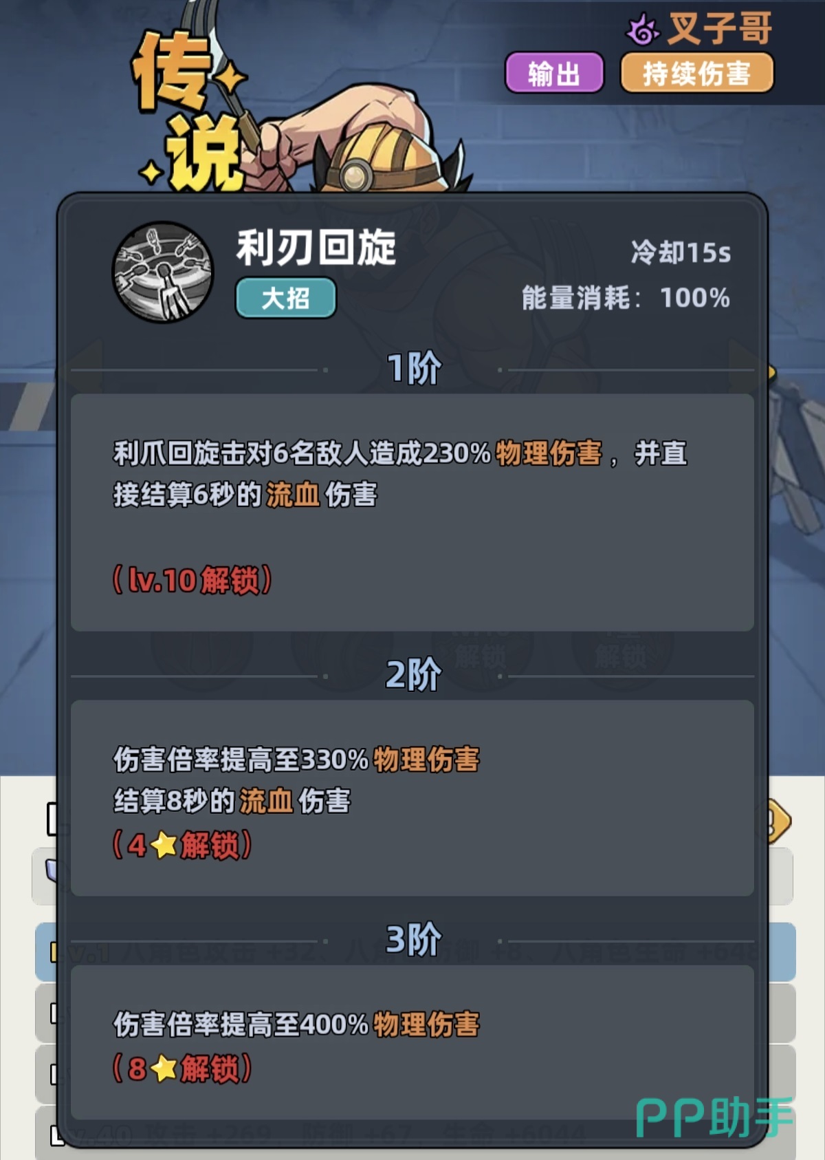 其主动技能以物理伤害为基底,附带流血效果;目标进入流血状态后,每秒承受固定比例的持续伤害。关键机制在于:当同一目标再次被施加流血时,原有流血持续时间将重置刷新,实现无缝覆盖。这一特性配合被动技能(普攻命中有概率追加流血,且对已流血目标提升攻击速度),使叉子哥能在3秒内快速叠满多层流血。大招则对范围内敌人造成物理伤害,并立即结算当前所有流血层数的总伤害,形成集中式小范围爆发,大幅提升收割效率。