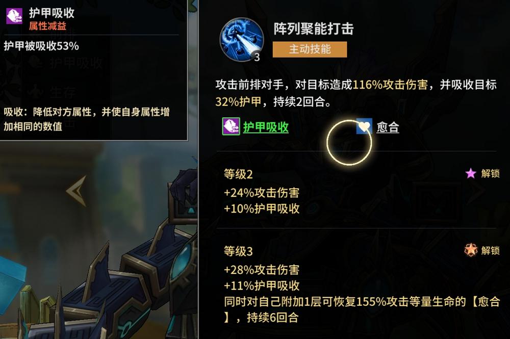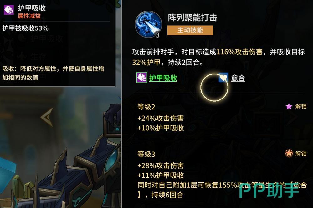 西佩托——前排生存标杆。其主动技能不仅对敌方前排造成伤害,更可叠加护甲吸收效果:该效果并非单纯减伤,而是通过压制对手属性成长、同步强化自身属性的方式实现攻防转化,并附加持续6回合的生命恢复效果。被动方面兼具治疗、免伤、反击与反制能力:受击时有概率触发反击,同时按自身攻击力百分比恢复生命;还可降低攻击者暴击率与技能倍率,从根源上削弱敌方输出节奏,是整套阵容的承伤支点。