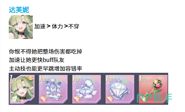 达芙妮的职能本质是“承伤枢纽+节奏引擎”。她通过主动技能的位移跳跃机制抢占先手,并在承受伤害过程中为全队叠加持续增益。因此速度属性直接决定其技能循环频率与buff覆盖率;体力则保障其在高压环境下维持站场时间。在资源有限时,可优先确保速度达标,再逐步补足生存能力,而非平均分配属性。