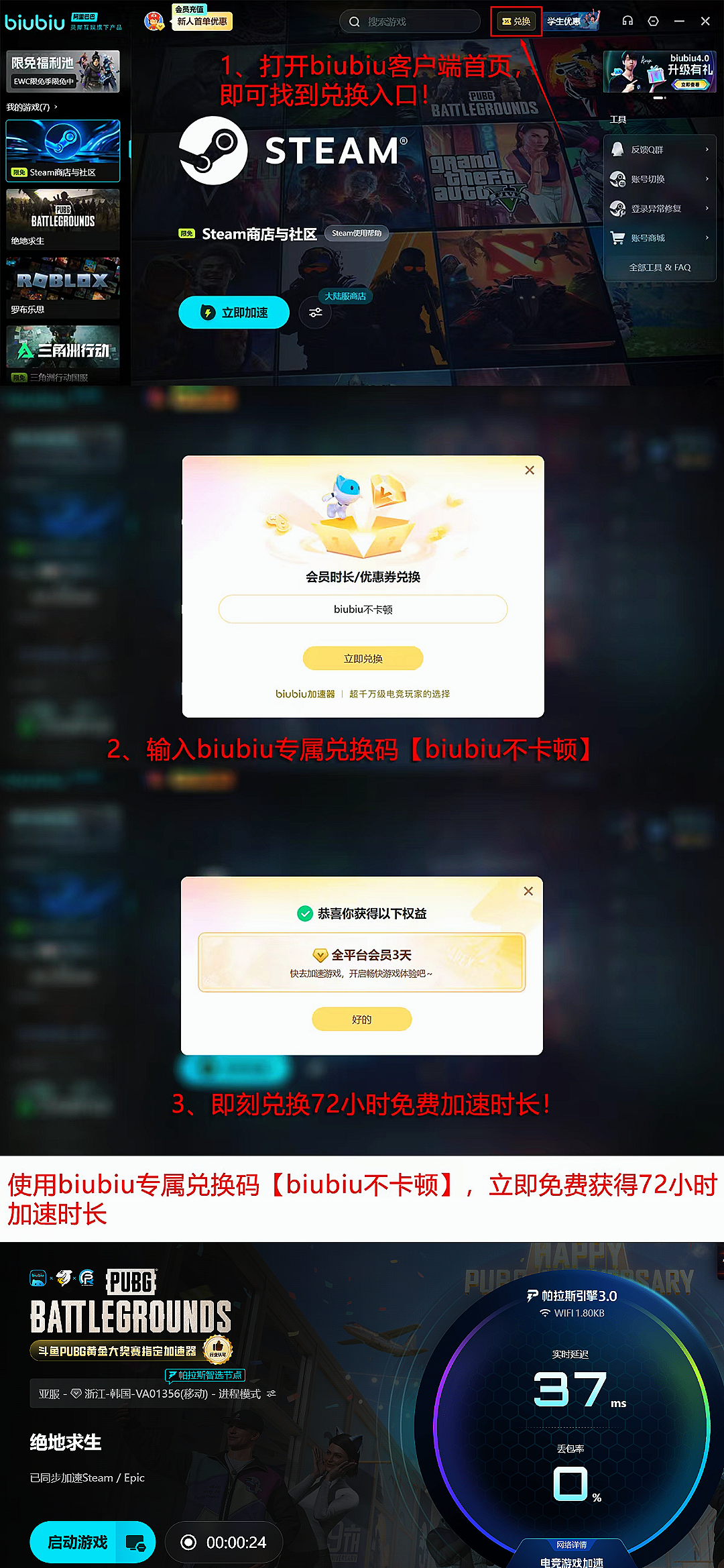 加速服务同样配套丰富福利:新用户注册成功后,自动解锁**24小时全游戏不限速加速权限**,无地域与时段限制;所有用户还可前往APP内兑换中心,输入口令【biubiu不卡顿】,额外领取**3天加速时长**;新老用户叠加使用,最高可享**96小时连续加速体验**。
