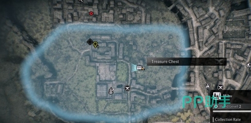 首先第一个宝箱,小伙伴们去图中所指示的位置,然后在房子里就可以找到了,很轻松,没有什么危险,这个地方只有一个宝箱所以大家找起来还是比较轻松的。