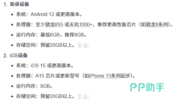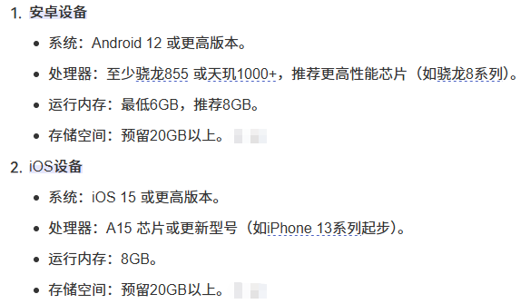 iOS平台最低配置要求:系统版本需升级至iOS 15或更高;芯片须为Apple A15仿生处理器及以上型号;运行内存不低于8GB;设备可用储存空间需预留20GB以上。