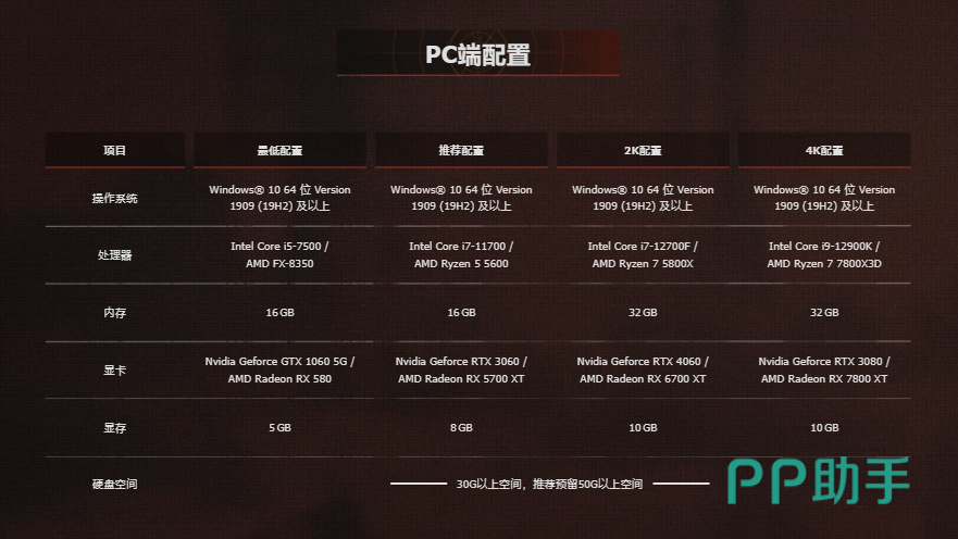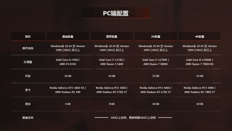 PC端配置要求整体较为宽松,基础运行仅需Windows 10 64位操作系统与NVIDIA GeForce GTX 1060级别显卡;但需特别注意,最低内存要求为16GB,部分仍使用8GB或12GB内存的台式机或笔记本用户需提前升级硬件以保障稳定性。更高阶配置详情可参考下图所示参数表。